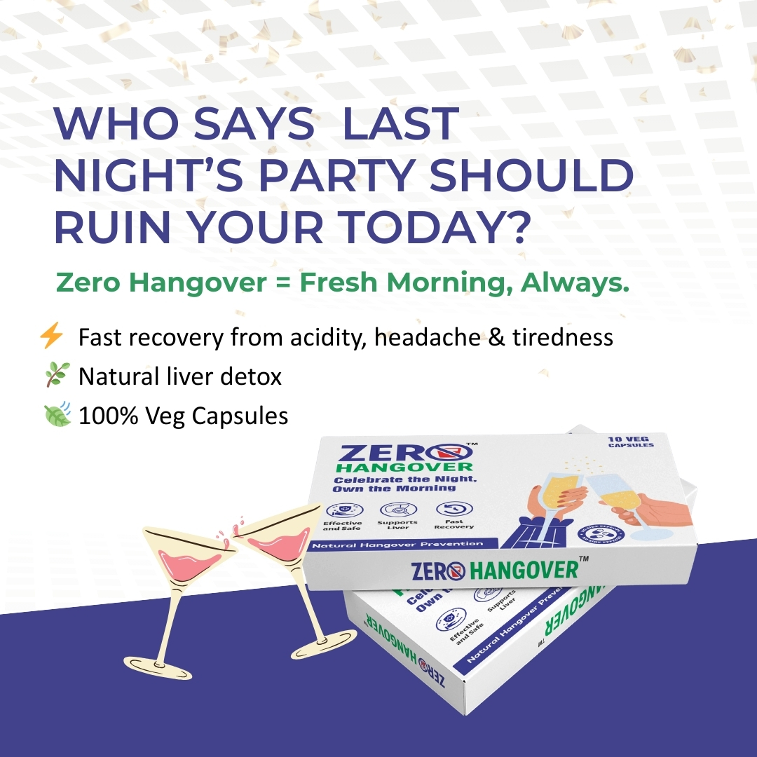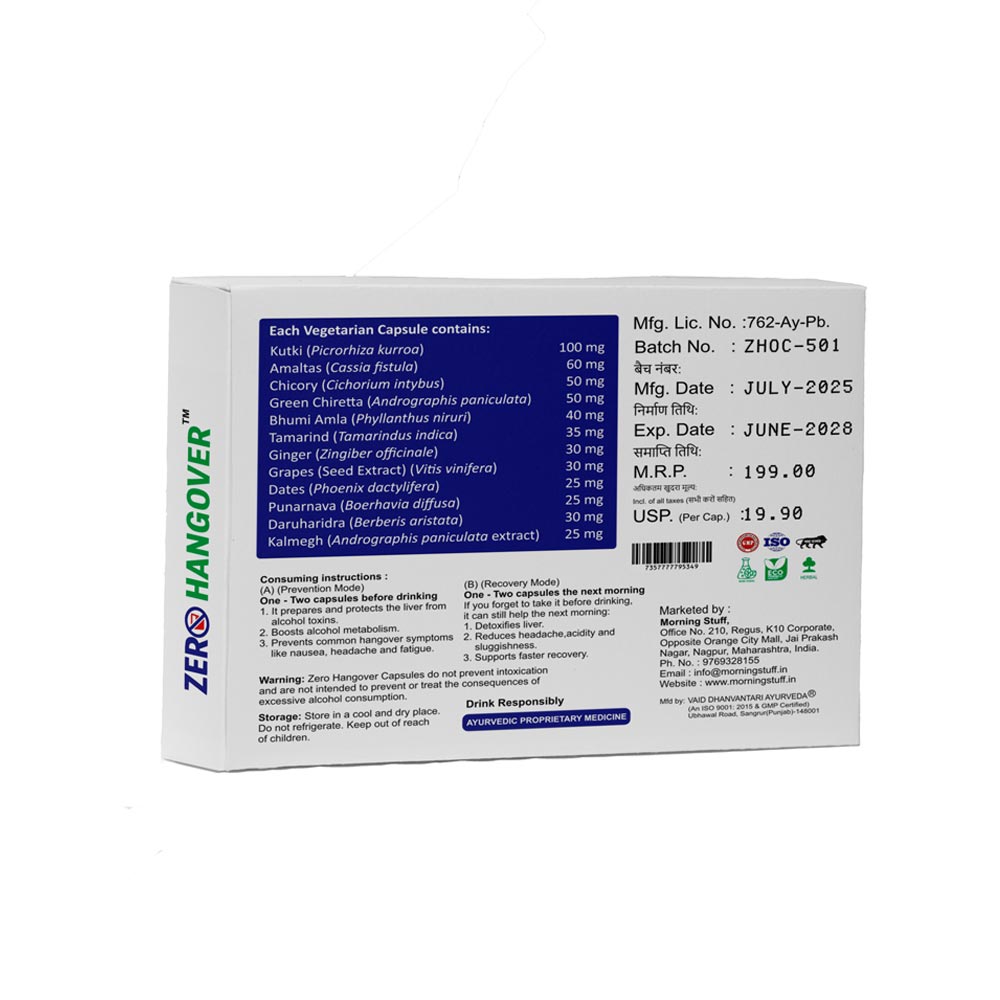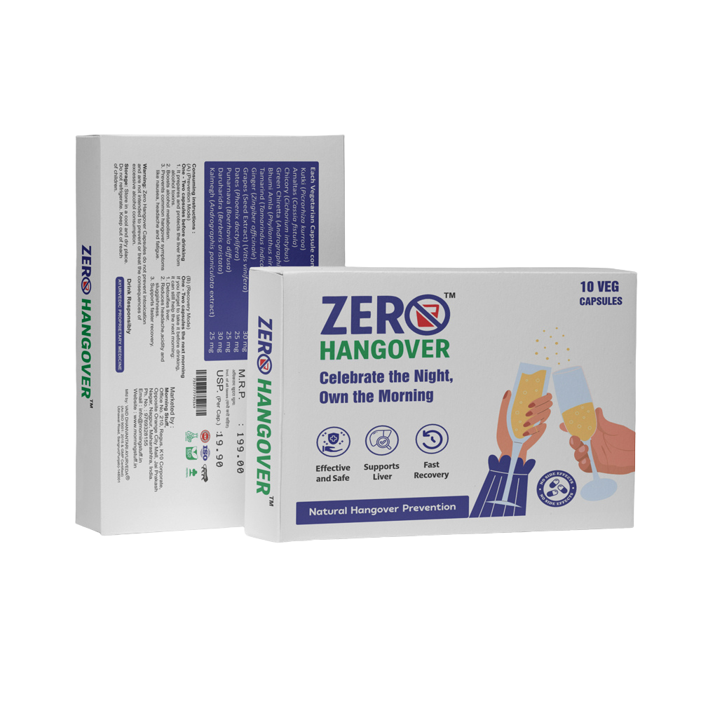 Zero Hangover capsule alleviates indigestion, liver disorders, and stomach ailments, thereby causing relief from the classic symptoms of a bad hangover. You don’t require a doctor’s prescription for consuming these capsules for hangovers on a regular basis. However, if you have had a long-existing chronic condition, it is best advised to consult a doctor for an individual assessment. You can consult our ayurvedic doctors for personalised advice. You can consume Zero Hangover Capsule on a regular basis with water and also consume them right before drinking alcohol.